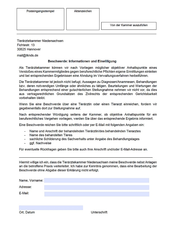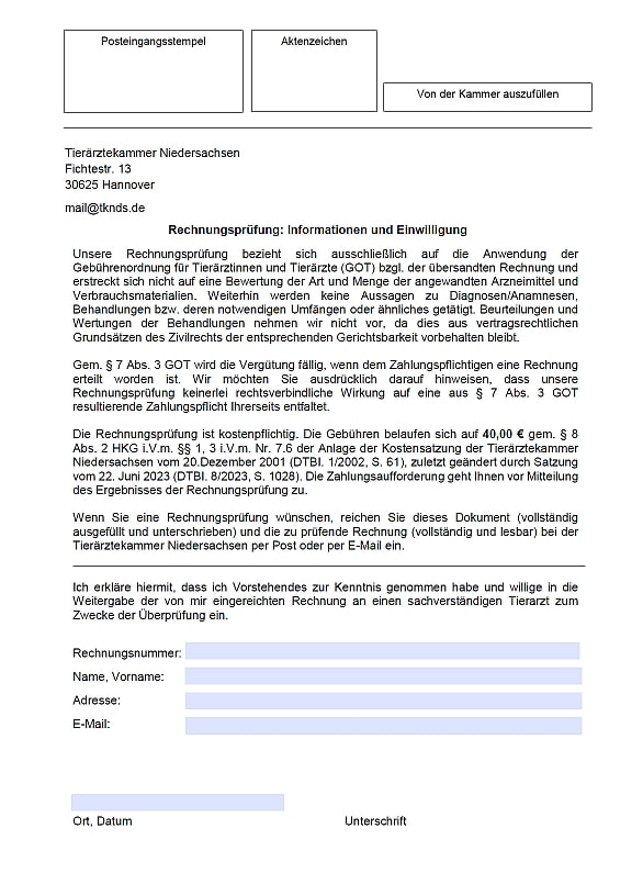 Sie können sich sowohl mit einer Beschwerde als auch mit einer Bitte um Rechnungsprüfung an die Tierärztekammer Niedersachsen wenden.